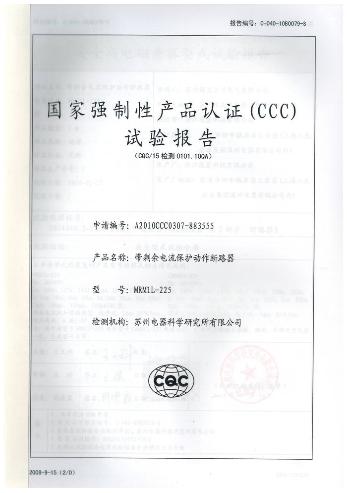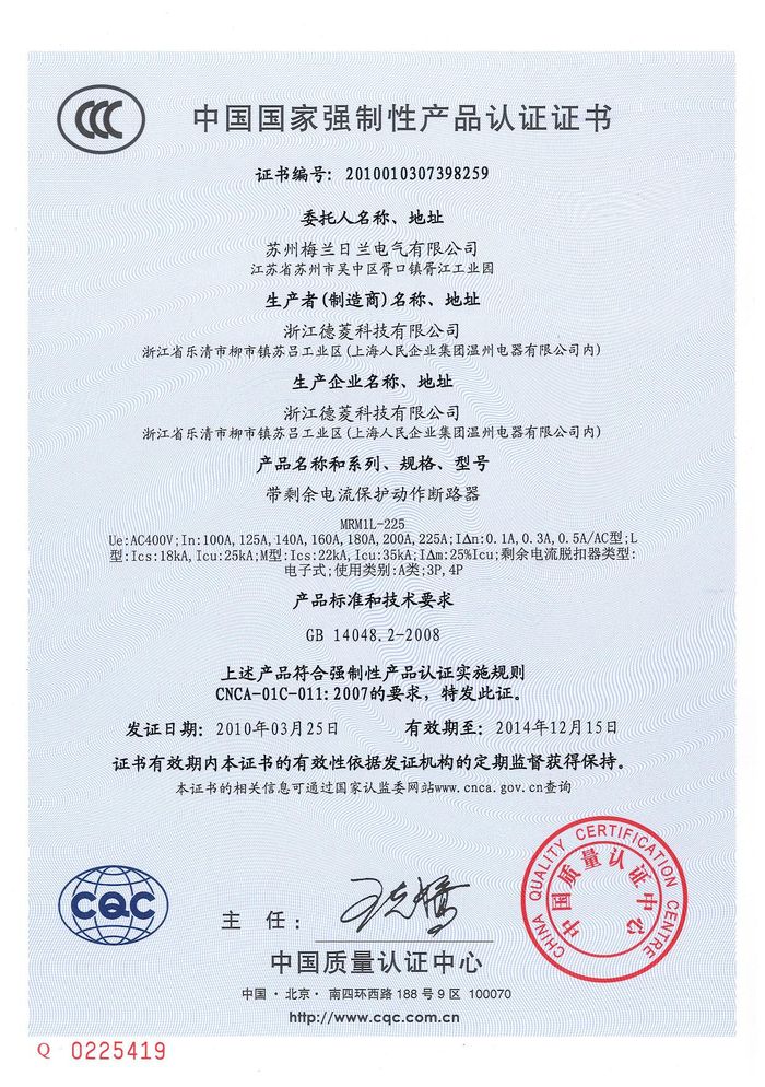 MRM1L-225塑殼漏電資質(zhì)證書(shū)