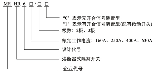 MRHR6系列熔斷器式隔離開關(guān)(以下簡稱開關(guān))主要用于額定電壓交流380V和660V (45~62Hz),約定發(fā)熱電流至630A的具有高短路電流的配電電路和電動機電路中,為電源開關(guān)、隔離開關(guān)、應急開關(guān)、并作電路保護之用,但一般不作為直接開閉單臺電動機之用。