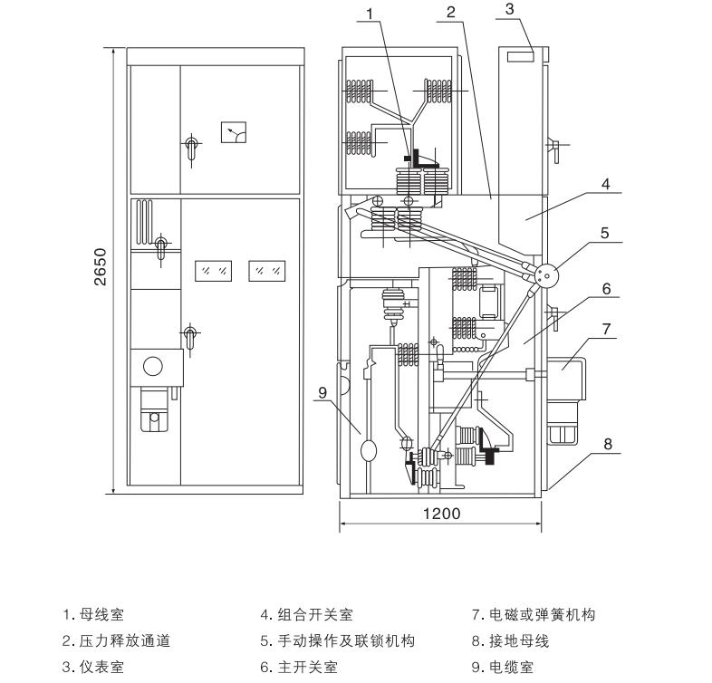 本開關柜為金屬封閉箱型結構,柜體骨架由角鋼焊接而成.柜內用鋼板分隔成斷路器室,母線室,電纜室,繼電器室,并可通過門面上的觀察窗和照明燈觀察柜內各主要元件的運行情況。為提高開關柜的技術性能,各主要元件進行了重新設計(如斷路器,旋轉式隔離開關等),根據(jù)柜體布置,繼電器室可安裝繼電器,門上可裝設信號繼電器、指示儀表、信號燈,轉換開關安裝于操作小室。后面為母線室,下面為電纜室,用戶可方便地進行接線,前面為斷路器室,方便了開關柜主開關的檢修,柜體內部機構參見圖1、圖2和產(chǎn)品說明書。
